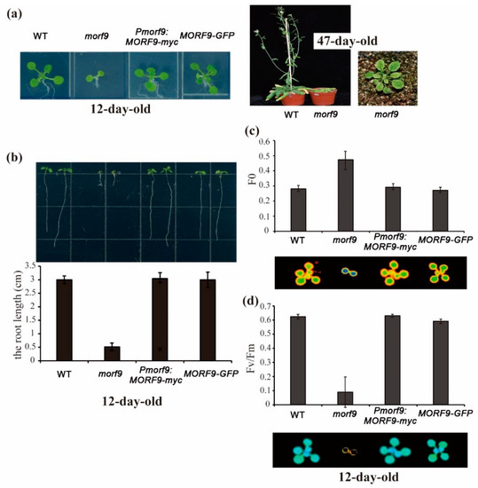 Phenotypes of morf9 mutant and transgenic plants. (a) Plants at 12 days after germination in MS medium and at 35 days after transfer to soil; (b) Root morphogenesis of the morf9 mutant and transgenic plants. The lower panel shows the average root length of 10 to 20 plants with standard errors; (c,d) Imaging and quantification of the leaf initiation fluorescence yield (F0) and efficiency of photosystem II (Fv/Fm) in plants with indicated genetic background at day 12 after germination, respectively. Data represent the mean of at least five plants with SE.
