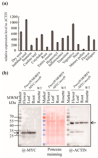 MORF9 transcript and protein levels in various tissues and organs. (a) The transcript levels of MORF9 in various tissues and organs retrieved from public datasets [33]; (b) Protein levels of MORF9 in various organs in Pmorf9:MORF9-myc plants, determined by using an antibody against MYC. The same membrane was subsequently probed with an anti-ACTIN antibody for loading control. Ponceau staining prior to immunodetection shows total proteins on the membrane. Arrows indicate the expected bands.