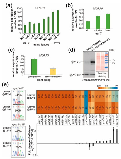 Alteration of MORF9-associated RNA editing efficiency during leaf senescence in WT Arabidopsis. (a) MORF9 mRNA levels of subsequent rosette leaves of mature plants; (b) MORF9 mRNA levels of leaf 7; (c). MORF9 mRNA levels of rosette leaves of young and aging plants; (d). Western blot of MORF9-MYC fusion protein in rosettes of plants expressing the tagged MORF9 driven by the native promoter. The Ponceau staining of the same membrane and Western blotting of ACTIN by anti-ACTIN antibody were used to control gel loading; (e) Plastid RNA editing efficiency in leaves of 12-day-old and 21-day-old plants. Full dataset are provided in Supplemental Table S2.