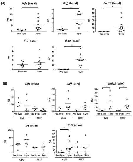 - Ishikawa, S.; Sato, T.; Abe, M.; Nagai, S.; Onai, N.; Yoneyama, H.; Zhang, Y.; Suzuki, T.; Hashimoto, S.; Shirai, T. Aberrant high expression of B lymphocyte chemokine (BLC/CXCL13) by C11b+CD11c+ dendritic cells in murine lupus and preferential chemotaxis of B1 cells towards BLC. J. Exp. Med. 2001, 193, 1393–1402. [Google Scholar] [CrossRef]