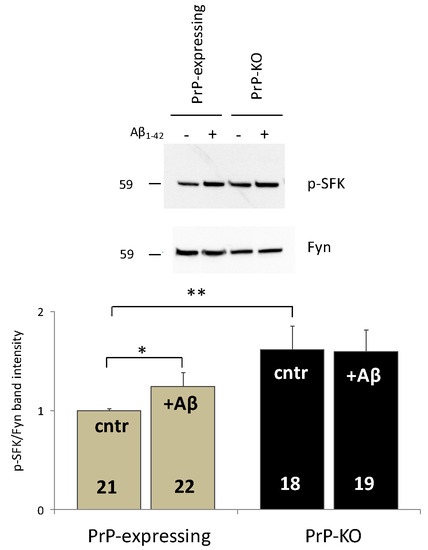 Soluble Aβ1–42 oligomers abrogate the PrP-dependent control over Fyn in PrP-expressing primary cortical neurons. Both the representative western blot (WB) obtained after probing PrP-expressing and PrP-KO cortical neurons (treated (+), or not (−), with Aβ1–42 oligomers) with antibody to active (auto-phosphorylated, p) SFK or total Fyn (upper panel), and the densitometric analysis of the pSFK immuno-reactive bands normalized to the corresponding signal of total Fyn (lower panel), show that Aβ addition significantly relieves the restriction on Fyn activation observed in untreated PrP-expressing controls relative to PrP-KO counterparts (cntr, grey and black bars, respectively). Conversely, no impact of Aβ was observed in PrP-KO neurons (see text for the explanation of the higher Fyn activation in untreated PrP-KO neurons). After seven days in culture, primary cortical neurons (isolated from PrP-expressing and PrP-KO mice lines Tg46 and F10, respectively [57] (Authorization n. 13/2012), and cultured as previously described [46]), were incubated (1 h, 37 °C), or not, with Aβ1–42 oligomers (5 µM, prepared and oligomerized as in [45]), and then lyzed using an ice-cold buffer containing glycerol (10% (w/v)), SDS (2% (w/v)), Tris/HCl (62.5 mM, pH 6.8), urea (1.8 M), Na3VO4 (5 mM), and cocktails of protease and phosphatase inhibitors (Roche). Total protein quantification, WB and densitometric analyses were accomplished as described elsewhere [45]. Here and after, values are expressed as mean ± SEM, and the number of replicates (i.e., different replicates from at least four primary cortical cultures prepared on different days) is indicated inside each bar diagram. * p < 0.05, ** p < 0.01 (Student’s t-test).