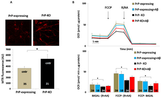 PrPC controls mitochondrial oxygen consumption rate so as to reduce ROS production. (A) Higher quantities of reactive oxygen species (ROS) are present in mitochondria of control PrP-KO cortical neurons compared to the PrP-expressing counterparts. This is evident from both the upper panel, showing representative fluorescence micrographs of neurons loaded (30 min, 37 °C) with the ROS-sensitive mitochondrial matrix-accumulating cationic probe MitoTracker Red (MTR, 50 nM (λexc = 579 nm, λem = 599 nm), Molecular Probes), and the lower bar diagram reporting the corresponding MTR fluorescence quantification. Coverslip images were collected using an inverted microscope (Olympus IMT-2) equipped with a Xenon lamp, a 40× oil-immersion objective, appropriate excitation and emission filters and a cooled 16-bit digital CCD camera (Micromax, Princeton Instruments). Following the selection of mitochondria-rich fields in each coverslip, their mean MTR fluorescence was calculated after subtracting the background fluorescence collected in dark fields. (B) Compared to PrP-expressing neurons (grey), PrP-KO neurons (black) have a reduced oxygen consumption rate (OCR), as both OCR representative traces (upper panel), and their quantification (lower panel), indicate. Quantification of basal (BASAL-(R + AA)) and maximal (FCCP-(R + AA)) OCR values were calculated by subtracting non-mitochondrial OCR value, obtained after adding mitochondrial respiration blockers antimycin A (AA) and rotenone (R), from the OCR measured, respectively, before and after addition of the respiration uncoupler carbonyl cyanide 4-(trifluoromethoxy)phenylhydrazone (FCCP). Mitochondrial spare respiratory capacity (FCCP-BASAL) was calculated by subtracting the basal OCR value from the maximal OCR value. These results suggest that the slower electron flow by mitochondria of PrP-KO neurons renders more reduced the redox centers of the respiratory chain complexes of these cells, favoring the supply of electrons to oxygen and the production of superoxide anion radicals. However, Aβ-addition does not significantly alter the OCR in either PrP-expressing (light blue) and PrP-KO (red) neurons. For these measurements, neurons were isolated and plated onto XF24 microplate wells (Agilent) for seven days, at the end of which they were treated, or not, with Aβ1-42 oligomers. OCR values were real-time assessed with the XF24 Extracellular Flux Analyzer (Agilent), which allows to measure OCR changes after the sequential addition of FCCP (0.5 µM), and antimycin A (1 µM) plus rotenone (1 µM) together. Results were normalized to the protein content determined by a commercial kit (Total Protein Kit, micro Lowry, Peterson′s modification, Sigma). * p < 0.05 (Student′s t-test). Other details are as in the legend to Figure 1 and Figure 2.