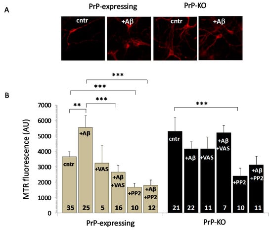 Aβ1–42 causes a PrP-dependent mitochondrial ROS overload in PrP-expressing neurons through activation of NADPH oxidase. (A,B) Starting from the higher ROS quantity present in mitochondria of untreated PrP-KO neurons than in the PrP-expressing counterparts (cntr), Aβ addition (+ Aβ) increases mitochondrial ROS only in PrP-expressing neurons as clearly demonstrated by the representative fluorescence micrographs of neurons loaded with the mitochondrial ROS-sensitive dye MTR and acquired with a 40× objective (A), and the bar diagram reporting MTR fluorescence quantification (B). The source of such an Aβ-dependent supplementary ROS content in mitochondria of PrP-expressing neurons is the cytosolic NADPH oxidase, in light of ROS diminution upon inhibiting the enzyme with 3-benzyl-7-(2-benzoxazolyl)thio-1,2,3-triazolo(4,5-d)pyrimidine (VAS 2870, 10 µM, 1 h, 37 °C) (+ Aβ + VAS). Also addition of the Fyn inhibitor 3-(4-chlorophenyl) 1-(1,1-dimethylethyl)-1H-pyrazolo(3,4-d)pyrimidin-4-amine (PP2, 10 µM, 1 h, 37 °C) reduces ROS presence in mitochondria of PrP-expressing neurons, either in the absence (+PP2) or the presence of Aβ oligomers (+ Aβ + PP2). This is consistent with the uphill stimulation of NADPH oxidase by Fyn and the relieve of the PrP-dependent block of Fyn activation by Aβ oligomers (Figure 1). However, the drastic ROS diminution observed in PrP-KO neurons treated with PP2 (+ PP2), but not with VAS (+ VAS), indicates that other Fyn-controlled (and PrP- and NADPH oxidase-independent) pro-oxidant pathways contribute to mitochondrial ROS accumulation. ** p < 0.01, *** p < 0.001 (Student′s t-test). Other details are as in the legend to Figure 1 and Figure 2.