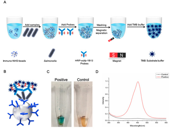 Schematic illustration of the AIB system for Salmonella detection. (A) Salmonella was captured by immuno-NHS beads (INBs), then labeled with specific HRP mAb 1B12 probes. The probe complexes changed color after addition of the TMB substrate solution. (B) Sandwich structure formed in the AIB system. (C) Images of the positive and control reactions in the AIB system. (D) Optical density of the positive and control reactions were recorded in the AIB system.