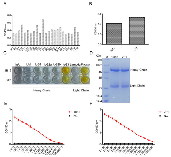 Two stable positive hybridomas were screened through three subcloning cycles from twenty-three originally positive wells, designated as 2F1 and 1B12 (Figure 2A). Reactivity of the two mAbs was determined via enzyme-linked immunosorbant assay (ELISA). The results showed that both mAbs reacted with Salmonella (Figure 2B). The immunoglobulin isotypes of 2F1 and 1B12 were determined using a mouse monoclonal antibody isotyping kit. Figure 2C shows 2F1 and 1B12 isotyped as IgG3, and the light chains of the two mAbs belong to the kappa chain. The two mAbs were used to produce ascites. The ascites was purified using protein A-sepharose and tested via sodium dodecyl sulfate-polyacrylamide gel electrophoresis (SDS-PAGE) (Figure 2D). The titers of mAbs 2F1 and 1B12 were evaluated via ELISA, and the titers of both mAbs reached 1:204800 (Figure 2E,F). The KD values of mAb 2F1 and 1B12 were measured as described in our previous published study [22], and were calculated as KD = 3.677 ± 0.33 nM for mAb 2F1 and KD = 1.126 ± 0.15 nM for mAb 1B12.
