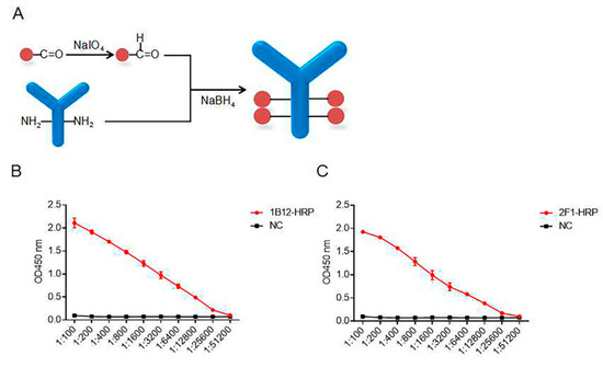 The purified mAbs 2F1 and 1B12 were dialyzed in phosphate-buffered saline (PBS) to remove the Tris-HCl and glycine. The purified mAbs and HRP were then coupled by an aldehyde–amino bridge under NaIO4 and NaBH4 (Figure 3A). The ratio of conjugation was calculated as 1 mg HRP/2.5 mg antibody. After conjugation, we acquired about 25 mg mAb probe containing 10 mg HRP. Next, the activities and titers of the two HRP mAb probes were determined by ELISA (Figure 3B,C).