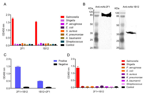 The reactivity and specificity of mAb 1B12 and 2F1 were evaluated via ELISA and Western blot. Figure 4A shows that both mAb 1B12 and 2F1 specifically recognized Salmonella and did not cross-react with similar microbial strains. The Western blot results showed that both mAbs recognized the different proteins on the surface of Salmonella (Figure 4B). The optimal mAbs used to establish the AIB system were screened based on double sandwich ELISA (DAS-ELISA). HRP-labeled mAbs (1B12 and 2F1) and unlabeled mAbs (1B12 and 2F1) were constructed in each group for the DAS-ELISA, which showed that the group composed of mAb 2F1 and 1B12 was more effective than the other groups (Figure 4C). In addition, we evaluated the specificity of the mAb 2F1 and 1B12 combination. Figure 4D shows that the group of composed of 1B12 and 2F1 displayed high specificity and did not recognize the control strains (E. coli, S. aureus, K. pneumoniae, Shigella, A. baumannii, P. aeruginosa, and Streptococcus). Figure 4C,D show that the mAb 2F1 and 1B12 group was the optimal combination for detection of Salmonella.
