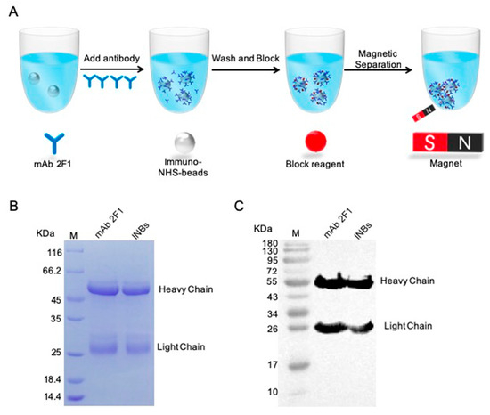 The INBs were generated by conjugating NHS modified magnetic beads (NHS beads) with mAb 2F1 via covalent coupling (Figure 5A). The prepared INBs were evaluated via SDS-PAGE and Western blot. The results demonstrated that mAb 2F1 had conjugated on the surface of the NHS beads (Figure 5B,C).