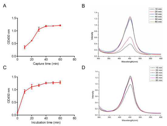 In the AIB system, we optimized each preparation step to achieve the best detection effect. Using gradient dilutions and plate counts, the average binding efficiency of the INBs was 90%. The optimum INB capture period was confirmed using various incubation times from 10 to 60 min. Figure 6A,B show that the INBs completely captured the Salmonella within 30 min. No significant differences were observed as the incubation time increased. The optimal incubation period, during which the mAb 1B12 probes formed sandwich products, was evaluated over 10 to 60 min (Figure 6C). The optical density from the formed sandwich products was determined via microplate reader. The sandwich products quickly formed within 20 min, demonstrating the high affinity between the mAb 1B12 probes and Salmonella (Figure 6D).