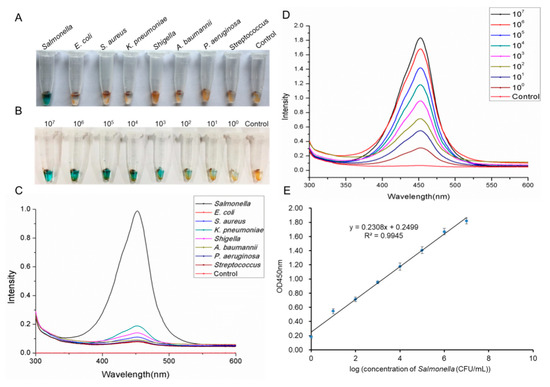 Evaluation of the AIB system. Specificity assay of the AIB system for Salmonella detection: (A) images and (C) optical density of Salmonella and non-target strains in the AIB system. Sensitivity assay of the AIB system for Salmonella detection: (B) change in color and (D) optical density due to different concentrations of Salmonella (from 107 CFU mL−1 to 100 CFU mL−1). (E) Plotted linear curve of the AIB system with Salmonella ranging from 107 to 100 CFU mL−1.