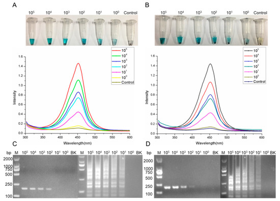 Salmonella detection in milk and egg samples using the AIB system. Salmonella detection in milk and egg samples with Salmonella concentrations from 105 to 100 CFU mL−1. The blue color and images of the optical density recorded in the milk (A) and egg (B) samples. The PCR and LAMP assays applied for the detection of Salmonella in milk samples (C) and egg samples (D). Abbreviations: BK = blank control.