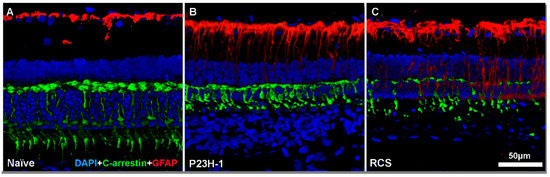 - Appelbaum, T.; Santana, E.; Aguirre, G.D. Strong upregulation of inflammatory genes accompanies photoreceptor demise in canine models of retinal degeneration. PLoS ONE 2017, 12, e0177224. [Google Scholar] [CrossRef] [PubMed]
