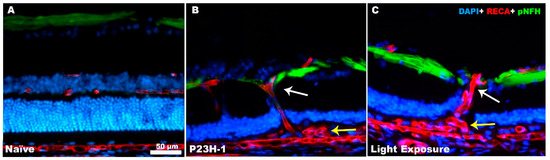 - Fernández-Sánchez, L.; Esquiva, G.; Pinilla, I.; Lax, P.; Cuenca, N. Retinal Vascular Degeneration in the Transgenic P23H Rat Model of Retinitis Pigmentosa. Front. Neuroanat. 2018, 29, 12–55. [Google Scholar] [CrossRef]