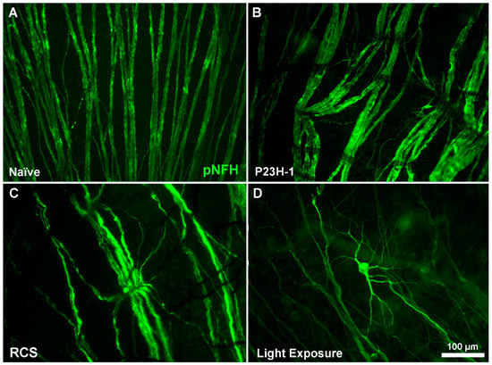 - Mazzoni, F.; Novelli, E.; Strettoi, E. Retinal ganglion cells survive and maintain normal dendritic morphology in a mouse model of inherited photoreceptor degeneration. J. Neurosci. 2008, 28, 14282–14292. [Google Scholar] [CrossRef] [PubMed]