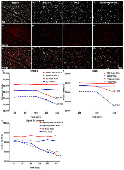 - García-Ayuso, D.; Salinas-Navarro, M.; Agudo, M.; Cuenca, N.; Pinilla, I.; Vidal-Sanz, M.; Villegas-Pérez, M.P. Retinal ganglion cell numbers and delayed retinal ganglion cell death in the P23H rat retina. Exp. Eye Res. 2010, 91, 800–810. [Google Scholar] [CrossRef] [PubMed]