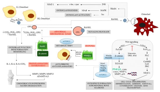 Signaling events and their consequences in osteoarthritic subchondral bone. Three classical factors—abnormal mechanical load, hypoxia and pro-inflammatory transformation play a trigger role in osteoarthritis (represented in red). Two types of osteoarthritic osteoblasts are illustrated: high-level (HL) and low-level (LL) synthesizer cells. The first type produces high levels of Cox-2, PGE2 and OPG and less RANKL; the second type has an opposite secretory pattern. The HL synthesizers maintain pro-inflammatory conditions in the subchondral bone, and they are increased in the presence of abnormal mechanical load, when they produce OPG, which may enhance focal osteosclerosis. The LL synthesizers release important quantities of RANKL, which activate osteoclasts by linking RANK. Signal cascades are activated via TRAF6, JNK, MAP and Src kinases, resulting in osteoclast differentiation and activation. Activation of Cox-2 and PGE2 stimulates the synthesis of IL-1, IL-6, and IL-8, which turn on the production of degradative MMPs in the cartilage. In normal conditions, osteoblasts rely for energy mainly on glucose, and PPARβ/γ enhances glucose uptake via the GLUT-1 transporter; however, in hypoxic conditions, the cells undergo a strong metabolic shift to anaerobic glycolysis, driven by mTORC2 that stabilizes RunX2. PPARβ/γ cooperates with canonical signal molecules, e.g., Wnt3a and Wnt10b, to exert anti-fibrotic and anti-inflammatory effects, further inducing OPG and RunX2 and fine-tuning osteoblast function, bone formation and remodeling. RunX2 alone induces RANKL and controls osteoclast function, but when acting together with β-catenin, it stimulates mainly osteoblasts, which increase trabecular bone volume. The two linker factors of OPG/RANKL and Wnt signaling, RunX2 and PPARβ/γ, are shown in green.