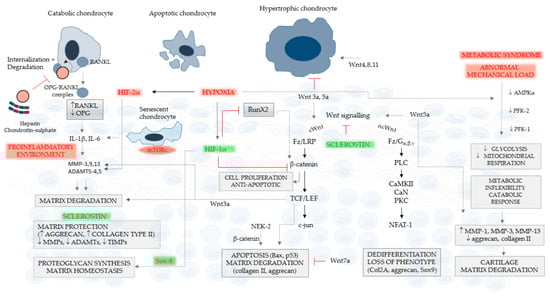 Effects of OPG/RANKL and Wnt signaling on chondrocytes and cartilage. The presence of catabolic, apoptotic and hypertrophic chondrocytes is a characteristic of osteoarthritis. Chondrocytes expressing RANKL release it in the soluble form, triggering IL-1β and IL-6 overexpression in the cartilage. Senescent chondrocytes contribute to this pro-inflammatory environment, increasing the synthesis of MMP-3, -9 -13, ADAMTS-4 and -5. The pro-inflammatory activity results in degradation of cartilage extracellular matrix. OPG links to RANKL and facilitates its internalization with consequent degradation. Sclerostin is a strong inhibitor of cartilage degradation, which suspends MMPs, ADAMTs and even their inhibitors—tissue inhibitors of metalloproteinases—stimulating in parallel aggrecan and collagen type II production. Canonical Wnt signaling and β-catenin are anti-apoptotic and stimulate chondrocyte proliferation; however, TCF/LEF is a downstream activator of apoptosis and matrix degradation. Hypoxia, triggering HIF-1α, generates an inhibitory effect on β-catenin and RunX2 and enhances the homeostatic effects of Sox-9. Non-canonical Wnt activation has different pathological consequences: chondrocyte dedifferentiation and loss of phenotype, the agonist Wnt5a up-regulating MMP-1, -3 and -13, and inhibition of aggrecan along with collagen type II. Wnt3a, together with Wnt5a, suspends hypertrophic transformation, while Wnt4, 8 and 11 are stimulatory. The metabolic syndrome and abnormal mechanical load down-regulate AMPKα, glycolysis and mitochondrial respiration in an adaptive response to hypoxia, which also results in a catabolic phenotype switch of chondrocytes. Factors of chondrocyte and cartilage deterioration are shown in red, and protective mediators are drawn in green.