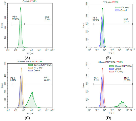 Time-dependent in vitro uptake of FITC labeled CNP°-CGA (fCNP°-CGA) in 786-O cell line was studied through fluorescent microscopic and flow cytometry analyses. FITC has the ability to conjugate with the primary amine group of CS through covalent bonding without dissociating and provides a sensitive study on cellular accumulation efficiency of fluorescently labeled nanoparticles under the influence of time (30 min, 6 h, 24 h, and 48 h) [52,97]. Supplementary 1 showed that the uptake of fCNP°-CGA in 786-O cells was time-dependent, as the fluorescent intensity increased consequently with incubation time. Cellular uptake of fCNP°-CGA was detected as early as 30 min (Supplementary 1C) post-treatment with weak fluorescent signals outlining the cells membrane observed; a small portion of fCNP°-CGA being taken up by 786-O cells. The fluorescent intensity in the cells thereafter increased in 6 h (Supplementary 1D), 24 h (Supplementary 1E), and 48 h (Supplementary 1F) post-incubation treatments.