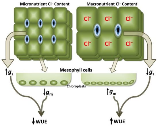 - Franco-Navarro, J.D.; Rosales, M.A.; Álvarez, R.; Cubero-Font, P.; Calvo, P.; Díaz-Espejo, A.; Colmenero-Flores, J.M. Chloride as macronutrient increases water use efficiency by anatomically-driven reduced stomatal conductance and increased mesophyll diffusion to CO2. Plant J. 2019, 99, 815–831. [Google Scholar]