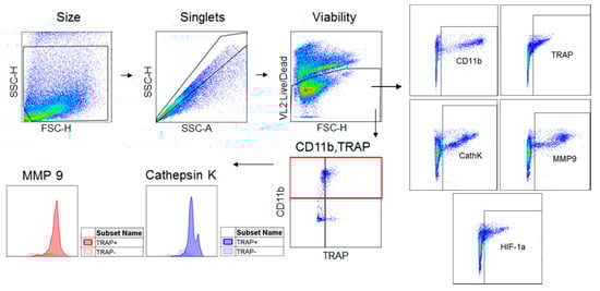 Flow cytometry gating strategy. Cells derived from culture or tissue samples were gated for size, singlets, and viability. Live cells were then analyzed for their expression of CD11b, TRAP, cathepsin K, MMP-9, and HIF-1α. The CD11b+ population was divided into TRAP− and TRAP+ populations which were analyzed for their expression of cathepsin K and MMP-9.