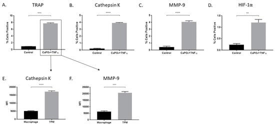 Treatment of macrophages with CaPO4 and TNFα results in osteoclastogenesis and increased protease production. RAW 264.7 macrophages were treated with CaPO4 and TNFα and analyzed for the percent of live cells expressing TRAP (A), cathepsin K (B), MMP-9 (C), and HIF-1α (D). (E,F) The expression (MFI) of cathepsin K and MMP-9, respectively, in TRAP+ cells (TPM) compared to TRAP− cells (macrophage). The data represent three independent experiments. Data are expressed as mean ± SEM. ** p < 0.01, *** p < 0.001, **** p < 0.0001. MFI, median fluorescence intensity.