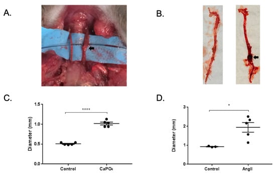 Mice treated via the CaPO4 and AngII models exhibited aneurysm formation in the carotid arteries and abdominal aortae, respectively, as defined by a 50% or greater increase in vessel diameter (Figure 3A,B, respectively). The treatment of carotid arteries in the CaPO4 model resulted in increased vessel diameter compared to untreated contralateral carotids (0.508 ± 0.01319 mm vs. 1.018 ± 0.03597 mm, p < 0.0001) (Figure 3C). Similarly, we found increases in the diameters of abdominal aortae upon administration of AngII compared to PBS-only controls (0.9267 ± 0.01764 mm vs. 1.942 ± 0.2552 mm, p < 0.05) (Figure 3D).