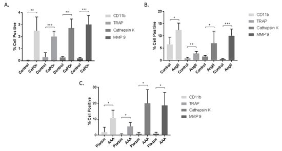 Cells from mouse CaPO4 (A), mouse AngII (B), and human (C) aneurysms exhibit increased expression of the myeloid marker, CD11b, and the osteoclastogenic markers TRAP, cathepsin K, and MMP-9. Tissues from CaPO4 mice (n = 5), AngII mice (n = 6) and PBS-only controls (n = 3), human AAA (n = 4), and human carotid plaques (n = 3) were enzymatically digested and processed to obtain single cell suspensions for flow cytometric analysis, as described in the Methods section. Data are expressed as mean ± SEM. * p < 0.05, ** p < 0.01, *** p < 0.001. AAA, abdominal aortic aneurysm.