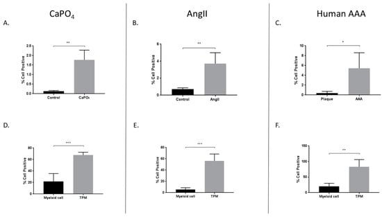 Additionally, we compared HIF-1α expression between myeloid and TPM cell populations from mouse and human aneurysms. The expression of TRAP is a long-established marker of osteoclastogenically activated macrophages []. Monocytes/macrophages are derived via the myeloid lineage, and CD11b is a reliable marker for these cells, which are the precursors to osteoclasts. We observed increased HIF-1α expression in TPMs from mouse CaPO4-induced aneurysms (21.73% ± 6.202% vs. 67.7% ± 2.195%, p < 0.001), AngII-induced aneurysms (5.572% ± 1.356% vs. 56.22% ± 5.458%, p < 0.001), and human AAAs (20% ± 4.952% vs. 82.8% ± 11.58%, p < 0.01) (Figure 5D–F, respectively).