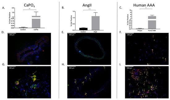 Mouse and human aneurysms contain more TPMs than non-aneurysmal control tissues. Mouse CaPO4 (A), mouse AngII (B), and human (C) aneurysms exhibit more TPMs (cells double-positive for expression of the myeloid marker, CD11b, and the osteoclast marker, TRAP) than respective controls. (A–C) show TPMs as a percentage of live cells in tissues from CaPO4 mice (n = 5) (A), AngII mice (n = 6) and PBS-only controls (n = 3) (B), human AAA (n = 4) and human carotid plaques (n = 3) (C). Tissues were enzymatically digested and processed to obtain single-cell suspensions for flow cytometric analysis, as described in the Methods section. (D–I) Immunofluorescence staining of frozen control and aneurysmal sections. Control sections (D–F), and aneurysmal sections (G–I) were stained for CD11b (red), TRAP (green), and DAPI (blue) as described in the Methods section. Yellow arrows indicate TPMs. 100× magnification (E,H), 200× magnification (D,F,I), 400× magnification (G). Data are expressed as mean ± SEM. ** p < 0.01, *** p < 0.001. TPM, TRAP-positive macrophage. AAA, abdominal aortic aneurysm.
