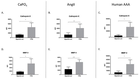 We hypothesized that TPMs found in aneurysmal tissues contribute to vessel degradation through elevated production of proteases such as MMP-9 and cathepsin K. Consequently, we compared the median fluorescence intensity (MFI) of MMP-9 and cathepsin K in myeloid (CD11b+, TRAP−) and TPM (CD11b+, TRAP+) cell populations derived from mouse and human aneurysmal tissues. In the mouse CaPO4 model, we found that TPMs expressed significantly more cathepsin K (1324 ± 123.4 vs. 4594 ± 955.2, p < 0.05) (Figure 7A) and MMP-9 (1739 ± 168 vs. 6477 ± 138, p < 0.05) (Figure 7D) than myeloid cells. Similarly, in the mouse AngII model, TPMs expressed more cathepsin K (1331 ± 340.6 vs. 4161 ± 739.1, p < 0.01) (Figure 7B) and MMP-9 (2536 ± 427.2 vs. 5851 ± 465.1, p < 0.001) (Figure 7E) compared to myeloid cells. In human AAA tissues, we also found that TPMs, when compared to myeloid cells, expressed more cathepsin K (5675 ± 1542 vs. 33604 ± 7540, p < 0.05) (Figure 7C) and MMP-9 (5444 ± 1891 vs. 27830 ± 5823, p < 0.05) (Figure 7F).