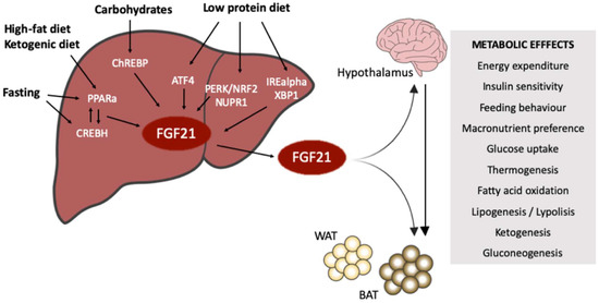 Finally, it is worth mentioning that FGF21 also controls the fasting-refeeding transition. Some authors described that, during the refeeding period, there is an induction of the expression of the FGF21 in eWAT and a repression of fasting-induced FGF21 expression in the liver [88]. The authors used a temporal fasting-feeding cycle where mice had access to food for 4 h daily. Other authors, through liver-specific knockout mice, pointed out that the circulating FGF21 during the refeeding period would still be coming from the liver [34]. Although in this case the refeeding period also induced the expression of FGF21 in the eWAT, this induction did not have an impact in the serum levels. The mechanism underlying the eWAT induction of FGF21 is still unknown. In humans, the induction of plasma levels of FGF21 under increases of glucose and insulin levels was also observed [89,90]. These data highlight the pleiotropic role of FGF21 in the maintenance of metabolic homeostasis and its tissue and nutritional-specific regulation.
