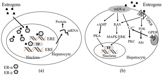 Figure 2. Intracellular pathways of estrogens via estrogen receptors (ERs) in hepatocyte cells. (a) Genomic effects of estrogens via nuclear ERs. (b) Non-genomic effects of estrogens via membrane-associated ERs. ERE = Estrogen response element; TF = Transcription Factor.