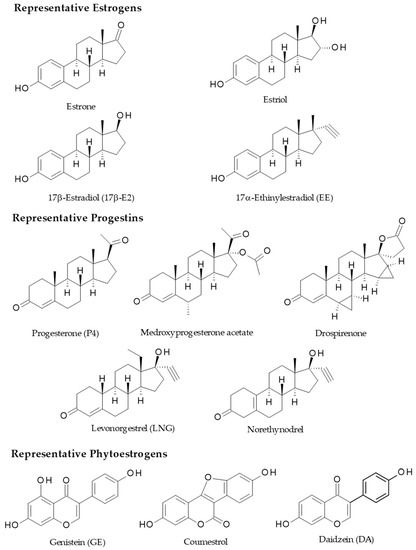 Figure 3. Chemical structure of representative estrogens, progestins, and phytoestrogens.