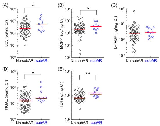 Tajima, S.; Fu, R.; Shigematsu, T.; Noguchi, H.; Kaku, K.; Tsuchimoto, A.; Okabe, Y.; Masuda, S. Urinary Human Epididymis Secretory Protein 4 as a Useful Biomarker for Subclinical Acute Rejection Three Months after Kidney Transplantation. Int. J. Mol. Sci. 2019, 20, 4699. https://doi.org/10.3390/ijms20194699