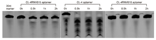 The original 39mer CL-4 aptamer was truncated to 27mer in length based on the predicted secondary structure using Mfold (http://unafold.rna.albany.edu/?q=mfold/rna-folding-form, access date: 30 July 2017) and RNAfold (http://rna.tbi.univie.ac.at/cgi-bin/RNAWebSuite/RNAfold.cgi, access date: 30 July 2017) web server platforms) [17,18] and synthesized as full 2′-OMe (CL-4RNV615), 2′-OMe/DNA mixmer (CL-4RNV616), full RNA (CL-4RNV617), and full DNA (CL-4RNV618) sequences (Table 1).