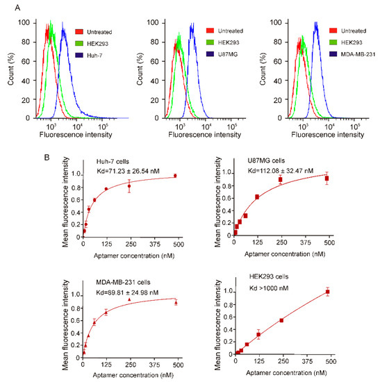 Cells were first incubated with blocking buffer for 1 h on ice (binding buffer plus 100 µg/mL tRNA and 1% BSA) followed by two washes with binding buffer prior to incubation with serial concentrations of FAM-labelled aptamer in a 200 µL volume of binding buffer for 1 h at room temperature. The cells were then centrifuged, washed with binding buffer, and resuspended in 200 µL binding buffer and subjected to flow cytometry analyses (Beckman Coulter Gallios, Indianapolis, IN, USA). The mean fluorescence intensity (MFI) of the untreated cells was subtracted from that of the aptamer treated cells to generate the MFI of specific binding.