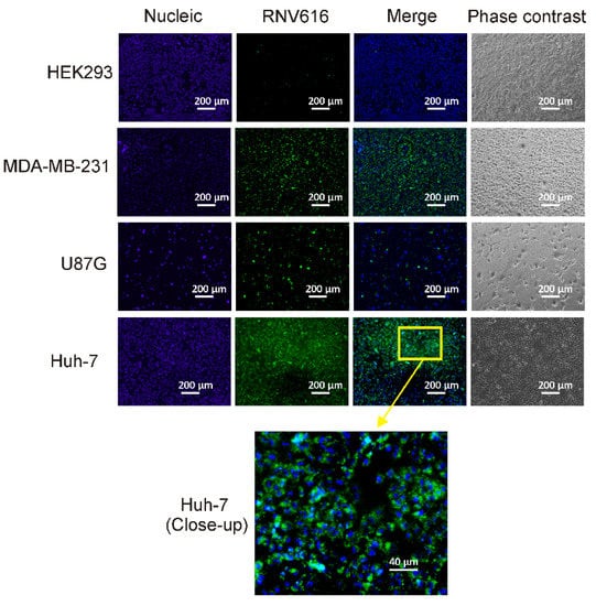 Specific binding of CL-4RNV616 aptamer to EGFR-positive cells. CL-4RNV616 aptamer specifically binds to EGFR-positive Huh-7, U87MG, and MDA-MB-231 cells but not to EGFR-negative HEK293 cells. Cells were imaged via fluorescent microscopy after incubation with 200 nM of aptamer at 37 °C for 30 min. Green, FAM (aptamer), and blue, Hoechst 33342 (nuclei).