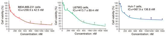 Evaluation of cytotoxicity and IC50 of CL-4RNV616 using EGFR positive Huh-7, MDA-MB-231, and U87MG cells.