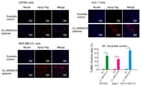 To investigate whether the newly developed 27mer CL-4RNV616 aptamer could inhibit cancer cell proliferation upon binding to EGFR, cytotoxicity assay was conducted using the EGFR positive U87MG, Huh-7, and MDA-MB-231cell lines. As shown in Figure S2, compared with the scrambled control group, 500 nM of CL-4RNV616 aptamer treatment significantly reduced cell viability in all of the tested cancer cells, whereas this was not observed in EGFR negative HEK293 cells. Further analysis to determine the half-maximal inhibitory concentration (IC50) revealed that CL-4RNV616 aptamer was effective in inhibiting cancer cell proliferation in a dose-dependent manner with an IC50 value of 258.9 nM for MDA-MB-231, 413.7 nM for U87MG, and 567.9 nM for Huh-7 cells respectively (Figure 6). To gain more insights on the anticancer potential of CL-4RNV616 aptamer, an apoptosis assay (TUNEL assay) was carried out using EGFR positive U87MG, Huh-7, and MDA-MB-231cell lines. As shown in Figure 7, after 72 h incubation with 500 nM of CL-4RNV616 aptamer, significant apoptosis was observed in all of the tested cancer cells. Compared to 2–3% apoptosis rate of the scramble control group, 63.4%, 51.8%, and 87.6% apoptosis rate were recorded in U87MG, Huh-7 and MDA-MB-231cells respectively, comparable to the 70.2% (U87MG), 53.4% (Huh-7), and 80.6% (MDA-MB-231) apoptosis rate induced by the original CL-4 aptamer (Figure S3). These data indicate that CL-4RNV616 aptamer-mediated inhibition of cell growth could be due to apoptosis activation effect, which is consistent with the previous observations with the original CL-4 aptamer in breast cancer [29] and lung cancer [16] cells.
