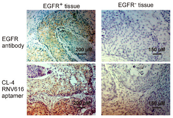 Antibody-based tissue immunostaining plays an important role in current cancer diagnosis [30]. However, the application of antibodies is compromised by their low stability and higher production and purchase costs [31]. Aptamers, often termed as chemical antibodies- possess certain advantages over antibodies such as low batch-to-batch variation, reduced production cost, prolonged shelf life and ability to incorporate various chemical modifications for enhanced binding capacity and stability [19,23], which make them ideal alternatives for antibodies in immunohistochemistry. In this work, we extended the application of the developed CL-4RNV616 aptamer to detect EGFR positive cancer using clinical breast cancer biopsies. As shown in Figure 8, similar with the commercial EGFR antibody control, CL-4RNV616 aptamer effectively recognized cancer nests of the EGFR positive breast tumor sections and did not bind to EGFR negative breast tumor sections as well as background cells within tumor sites. These results may validate the scope of CL-4RNV616 aptamer as a probe for EGFR detection in clinical cancer sections. In this work, although only paraffin-embedded breast biopsies were tested, considering the efficient binding capacity of CL-4RNV616 aptamer to EGFR proteins on living cells (Figure 4 and Figure 5), the application of this aptamer may also be extended to immunostaining of other cancer tissues for helping towards cancer detection.