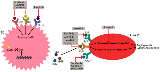 Bæk Møller, N.; Budolfsen, C.; Grimm, D.; Krüger, M.; Infanger, M.; Wehland, M.; E. Magnusson, N. Drug-Induced Hypertension Caused by Multikinase Inhibitors (Sorafenib, Sunitinib, Lenvatinib and Axitinib) in Renal Cell Carcinoma Treatment. Int. J. Mol. Sci. 2019, 20, 4712. https://doi.org/10.3390/ijms20194712