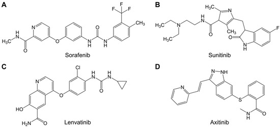 - Randrup Hansen, C.; Grimm, D.; Bauer, J.; Wehland, M.; Magnusson, N.E. Effects and side effects of using sorafenib and sunitinib in the treatment of metastatic renal cell carcinoma. Int. J. Mol. Sci. 2017, 18, 461. [Google Scholar] [CrossRef] [PubMed]