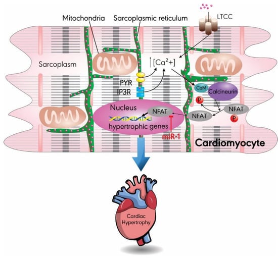 Calcium signaling is a known pro-hypertrophic pathway, where an increase in intracellular Ca2+ levels acts as a signal for hypertrophy by increasing cardiac output []. The calcium-dependent serine/threonine protein phosphatase, calcineurin, induces hypertrophy by acting through the transcription factor nuclear factor of activated T cells (NFATC) 3 [,,]. In human heart tissue samples and mice cardiomyocytes, overexpression of miR-1 ameliorated cardiac hypertrophy by decreasing the expression NFATC3. This was confirmed by a reduction in the cell surface area of cardiomyocytes and a decrease in the levels of beta-myosin heavy chains (β-MHCs), a marker of cardiac hypertrophy (Figure 2) [,].