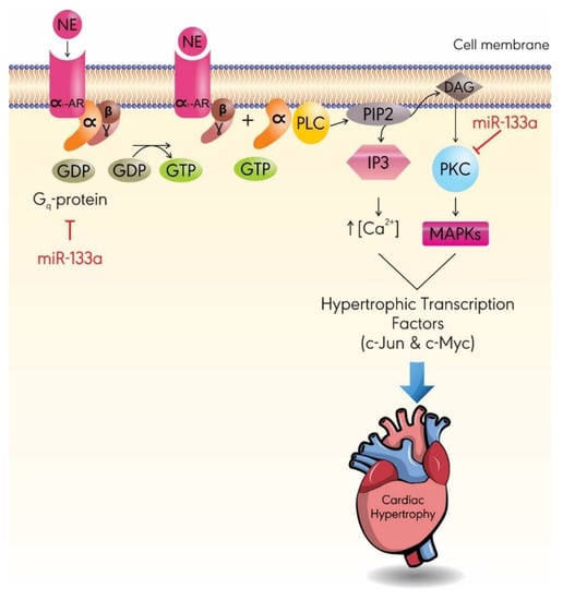 Recent evidence hints towards a potential interplay between miR-133a and α1-adrenergic receptor (AR)-mediated signaling, thereby affecting calcium-signaling. Indeed, miR-133a significantly inhibits norepinephrine (NE)-induced cardiac hypertrophy in vitro by downregulating levels of protein kinase C (PKC) and Gq protein []. As depicted in Figure 3, NE binds to α1-AR, which activates the PKC and phospholipase C (PLC) signaling pathway. PKC leads to the activation of transcription factors involved in cardiac hypertrophy through a mitogen-activated protein kinase (MAPK) cascade, whereas PLC signaling products—inositol 1,4,5-triphosphate (IP3) and diacylglycerol (DAG)—activates the calcium signaling pathway and PKC, respectively [,,]. Therefore, by targeting PKC and Gq, miR-133a can inhibit the increase in intracellular Ca2+ levels and the subsequent activation of hypertrophic transcription factors, such as c-Jun and c-Myc.