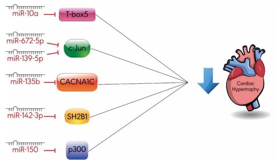 MiR-10a inhibits cardiac hypertrophy by downregulating the expression of T-box5, a transcription factor involved in cardiac development []. Both miR-672-5p and miR-139-5p ameliorate cardiac hypertrophy in cardiomyocytes by inhibiting the expression of another transcription factor c-Jun, a subunit of activator protein-1 (AP-1) [,]. Similarly, miR-150 mimics were shown to abrogate glucose-induced cardiomyocyte hypertrophy by repressing the expression of p300, a cofactor for various hypertrophy-responsive transcription factors [].