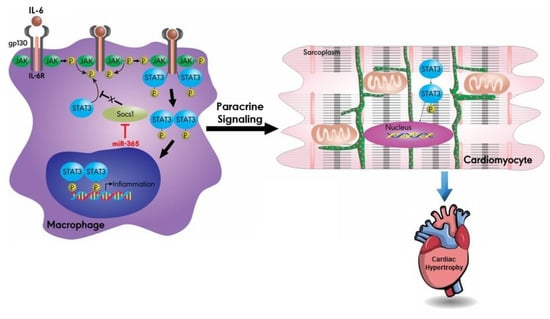 MiR-155 promotes cardiac hypertrophy by targeting pro-hypertrophic pathways, such as inflammation and calcium signaling [,,]. In one study, miR-155-expressing macrophages appeared to promote cardiac hypertrophy through the Janus kinase (JAK)/signal transducer and the activator of the transcription 3 (STAT3) pathway []. It has been proposed that the macrophage-expressed miR-155 induces the inhibition of the macrophage suppressor of cytokine signaling 1 (SOCS1), leading to the phosphorylation of STAT3 []. This phosphorylated STAT3 in macrophages then drives pro-hypertrophic paracrine signaling to cardiomyocytes, whose STAT3 activity gets potentiated, thereby leading to cardiac hypertrophy (Figure 5) [].