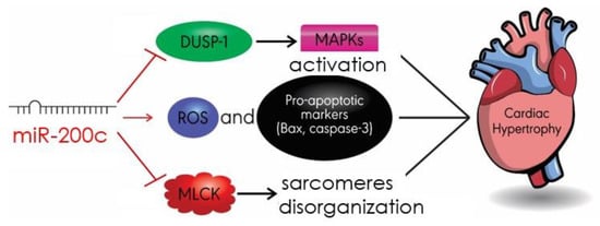 Another pro-hypertrophic miRNA is miR-200c, which is implicated in MAPK signaling and reactive oxygen species (ROS)/apoptosis pathways [,]. Dual-specific phosphatase-1 (DUSP-1) prevents cardiac hypertrophy by inactivating MAPKs, such as extracellular signal-regulated kinase (ERK1/2), c-Jun N-terminal kinase (JNK), and p38 []. Contextually, DUSP-1 was shown to be a target of miR-200c. For instance, miR-200c can induce diabetes-associated cardiac hypertrophy in high-glucose-treated cardiomyocytes, by downregulating the myocardial expression of DUSP-1 and thus activating MAPK proteins (Figure 6) [].