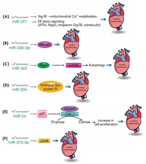Pro-hypertrophic miRNAs augment cardiac hypertrophy by targeting different pathways: (A) miR-297 inhibits the expression of Sig-1R and activates ER stress signaling; (B) miR-23b-5p represses HMGB2 expression; (C) miR-365 downregulates the expression of Skp2; (D) miR-206 negatively regulates the expression of Forkhead box protein P1; (E) miR-24 targets p27 and reduces its protein expression; (F) miR375-3p abrogates the expression of LDHB. ER: endoplasmic reticulum; HMGB2: high-mobility group box 2; LDHB: lactate dehydrogenase B chain; Sig-1R: sigma-1 receptor; Skp2: S-phase kinase-associated protein 2.