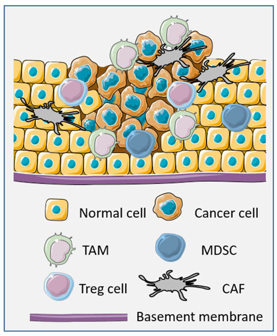 Representation of the tumor microenvironment (TME) with tumor-associated macrophages (TAMs), mesenchymal stromal/stem cells (MSCs), regulatory T-cells (T-regs), and cancer-associated fibroblasts (CAFs) infiltrating the tumor.