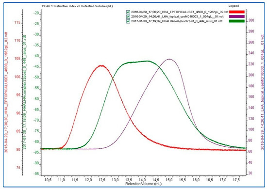 Refractive index (RI) measurements on Size Exclusion Chromatography -Triplo Detector Array (SEC-TDA) analyses. Overlay of HHA (red), LHA (violet), and HCC samples (green) after thermal treatment.